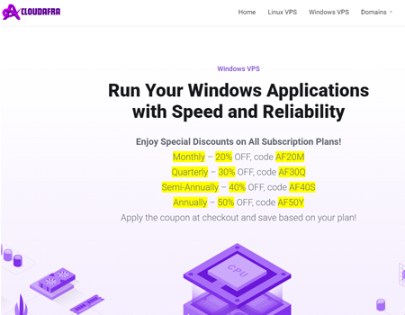 CloudAfra 是一家新兴的 VPS 服务提供商,专注于提供高性能的 Windows VPS,尤其是其日本节点 VPS 在高带宽、低延迟方面表现突出。CloudAfra 特别适合需要图形界面支持、数据库管理或应用程序托管的用户。品牌的特点是出色的稳定性和易于使用的控制面板,帮助用户在繁忙的工作中更高效地管理和维护服务器。