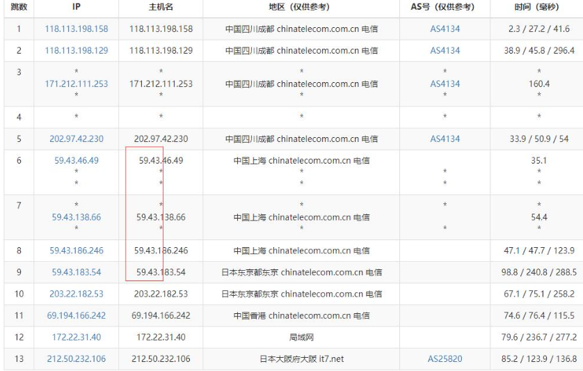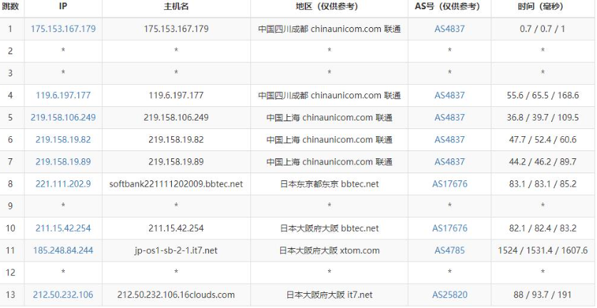 联通:从上海出发,经东京节点,再由软银线路进入日本境内到大阪机房。整体跳数中等,路由中沿途延迟较低。