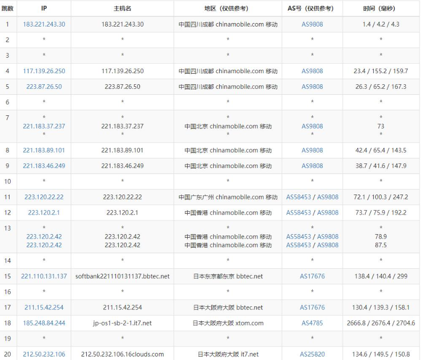 移动:从广州出发,先到香港节点,再至东京,最终到大阪;主要使用的是 CMI(中国移动国际网络)线路,中间有多个中转节点。此路线使得移动网络延迟与稳定性稍逊于电信与联通。